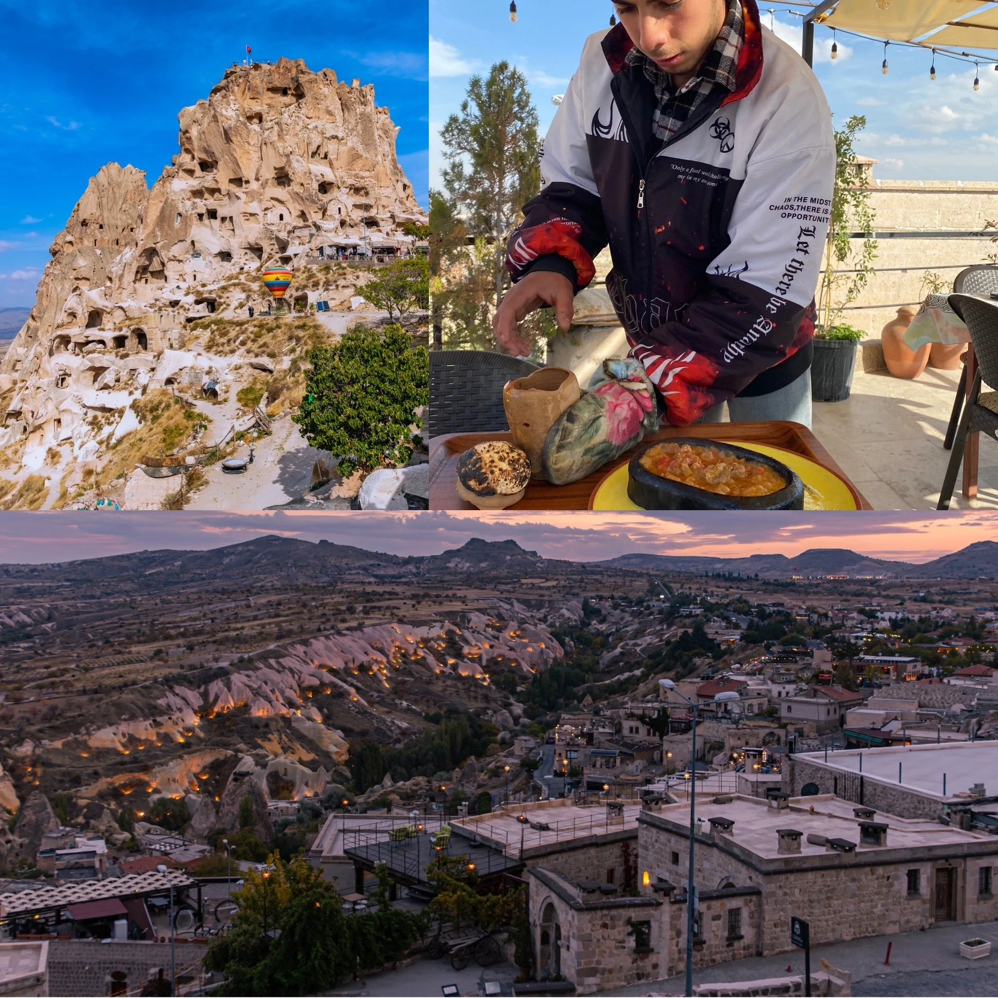 Top L-R: Uchisar Castle outside my hotel; experiencing Testi Kebab for the first time.