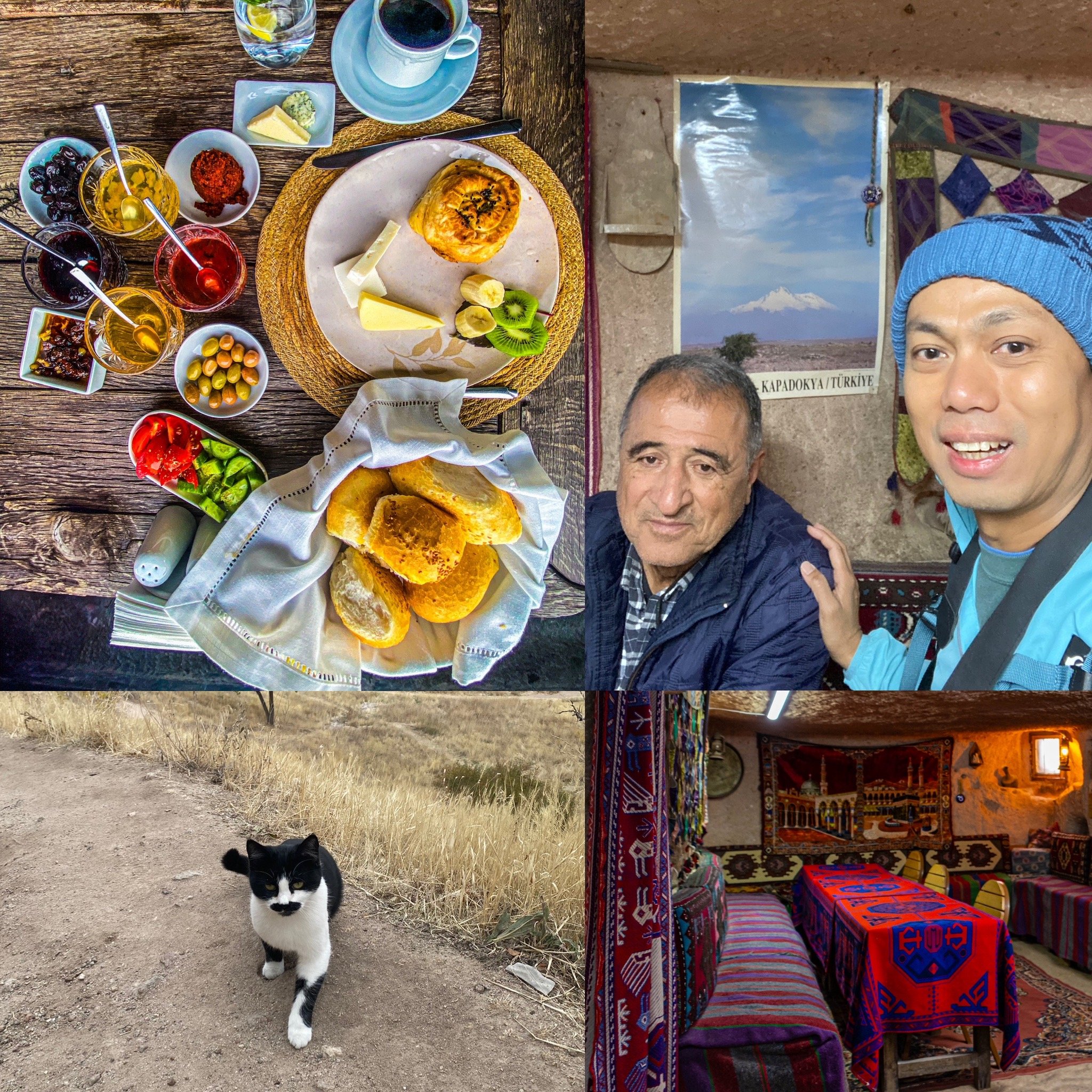 Bottom L-R: The cat that followed me throughout my trek; the traditional Turkish teahouse in one of the fairy chimneys.